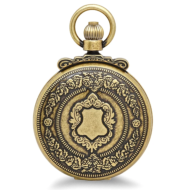 Unique vintage style blends with precise modern timekeeping in this antique goldtone pocket watch by Charles Hubert. The watch has an ornate design on front and back, with an engravable shield for initials on the front, and up to 3 lines of inscription on the back, all engraving available free of charge! Inside, the watch features a white dial with black Roman numerals, hands and subdial. The watch comes with a matching 12″ chain, and is packaged in a Charles Hubert gift box.