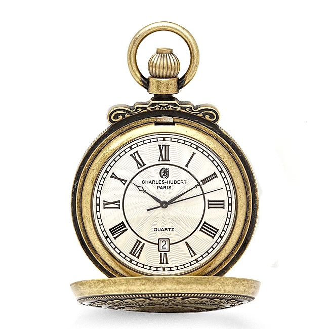 This vintage style antique gold-plated pocket watch features a locomotive chugging along in full steam, surrounded by a wreath of roses on the front cover. The rose wreath pattern is repeated on the back, surrounding a circular area for free engraving of to 3 lines of inscription. Inside, the watch features a white dial with black Roman numerals, hands, and date display. This historic pocket watch design comes with a matching 12″ chain, and is packaged in a Charles Hubert gift box.