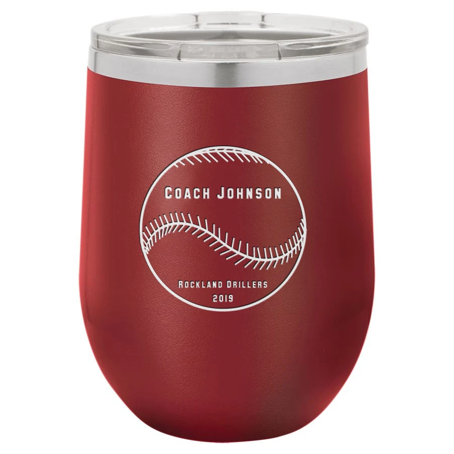 With a little imagination, you can give your coach a gift that’s sure to be used all the time! This 12 ounce Maroon polar camel stemless wineglass features a laser engraved baseball motif on the front that can be personalized with the coach’s name, team name and year. The wineglass comes with a with clear plastic lid, and has double wall vacuum insulation that keeps the wine cold 2 times longer than plastic or glass. This creative gift idea comes packaged in a gift box, ready to surprise the best coach ever!