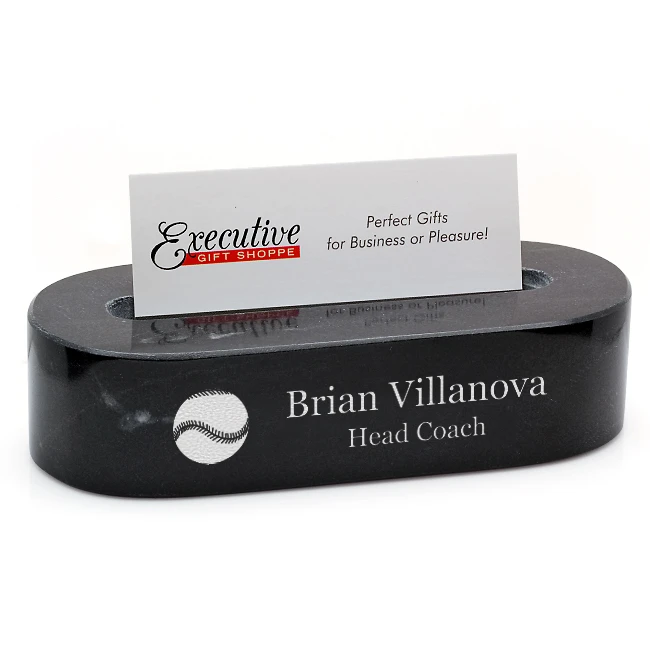 Professional accessories don’t have to be all work and no play! A home run hit for any baseball fan, this black marble oval business card holder features a laser-engraved baseball on the front. There’s room to add free personalization, creating a unique and effective professional accessory for the desktop or counter. The paperweight comes packaged in a gift box .