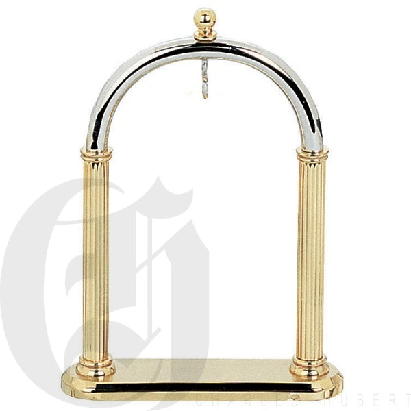 This two-tone gold and silver arched pocket watch stand, by Charles Hubert of Paris, is made of solid stainless steel, with two goldtone columns supporting a silver tone arched top. A hook is set in the arched to to hang your pocket watch to display on the desk, mantel, or night table. Add free custom engraving to the base plate to create a unique and stunning gift for any special occasion. This stand is packaged in a Charles Hubert gift box.