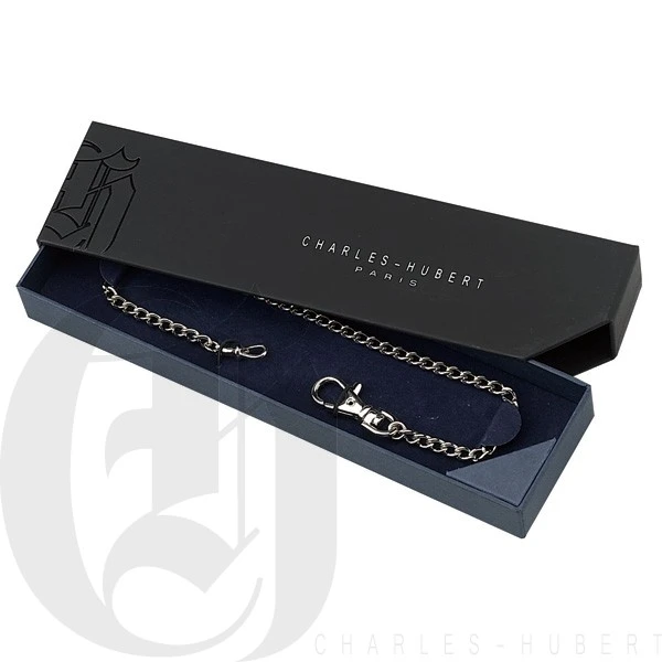Pass on your heirloom pocket watch to a family member who is graduating, getting married, or reaching a special milestone in his life. This polished stainless steel pocket watch chain is just what you need to make it shine like new! The chain measures 12″ long, and has a watch clip at one end and a lobster claw clasp at the other to attach to a belt loop. This chain is packaged in a Charles Hubert gift box.