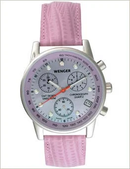 For the woman on the go who still enjoys her feminine side, this Wenger Commando Chrono wristwatch has it all! The watch is made in durable stainless steel, with screw-on water-resistant case back. The face is rose mother-of-pearl, with Swarovski crystal markers, luminous hands, and a date display, and is designed with a genuine calfskin leather strap in rose pink. The watch features a tachymeter on the bezel to measure speed over known distance. She will love the precision timing and multi-function of the Commando Chrono watch!