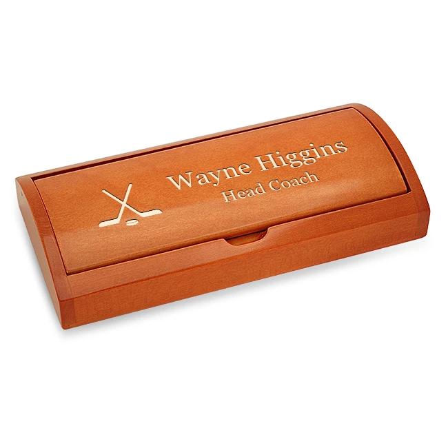 Hockey fans know that the sport is more than a bunch of guys randomly skating with sticks and getting into fights on the ice! It takes strategy and creative vision to score a goal! Score points with the hockey player or fan in your life with this classic ballpoint pen set. The pen is designed with a silver textured barrel with polished cap and a pocket clip, set in a rosewood case that is laser-engraved with a Hockey emblem. Laser-engraved personalization on the case and/or pen is free with your purchase. The set comes packaged in a gift box.