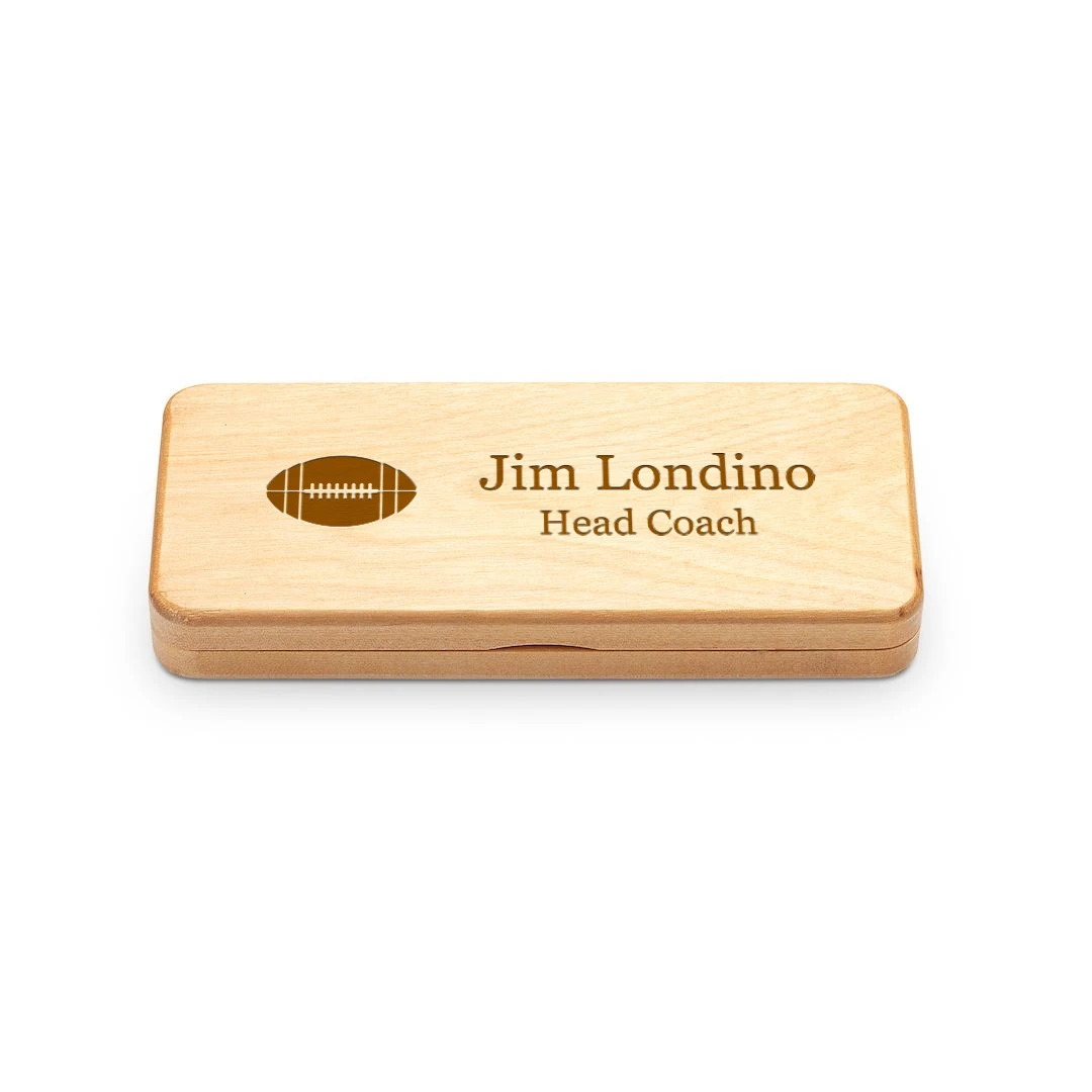 Whether the person on your gift list is a football player or coaches from the couch on weekends, they will appreciate the thought and use this pen and pencil set every day! The ballpoint pen and mechanical pencil are designed in maple wood with gold accents, and can be personalized. A matching maple wood case features a laser-engraved Football emblem, with space beside it for personalized engraved text. The set comes packaged in a gift box.