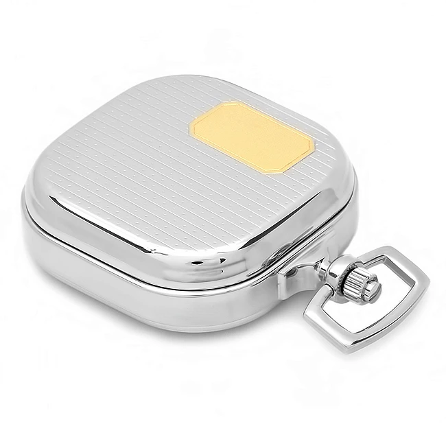 Give a gift that’s far from the ordinary with this polished two tone quartz pocket watch and chain by Charles Hubert. This unique, square shaped timepiece has a polished silver front cover with vertical pinstripes and a polished gold engraving plate. The plate can be engraved with up to three letters free of charge. The back cover is made of smooth polished silver and you can add up to four lines of free engraving there. Inside, it has a white dial with silver Roman numerals and silver hour, minute, and second hands. It also has a date sub-dial at six o’clock. This square shaped engravable pocket watch comes with a matching twelve inch chain and is packaged in a Charles Hubert gift box.