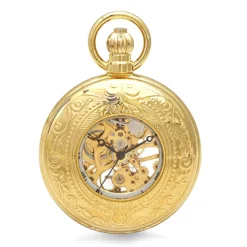 - Polished gold tone quartz pocket watch with matching 12″ chain