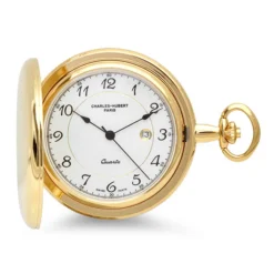 Give him elegant style at an affordable price with this polished gold tone pocket watch by Charles Hubert. The timeless design features a white dial with black Arabic numerals, a date display, and black hour, minute and second hands. The watch has a scratch-resistant crystal lens, and a 12″ gold tone chain. Add free custom personalization, with up to 4 lines of engraving on both the front and back of the cover. The pocket watch comes in a handsome Charles Hubert gift box.