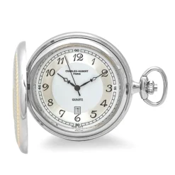 A special gift for a special guy, this Charles Hubert silver-plated pocket watch has an ornate embossed pattern and is accented with a gold-plated border, banner and shield. The shield is designed to be engraved with up to 3 initials, available free of charge. Inside the front cover, a white dial has contrasting black Arabic numerals, hands, and date sub-dial at 6:00. This unique, personalized pocket watch comes with a matching 12″ chain, and is packaged in a Charles Hubert gift box.