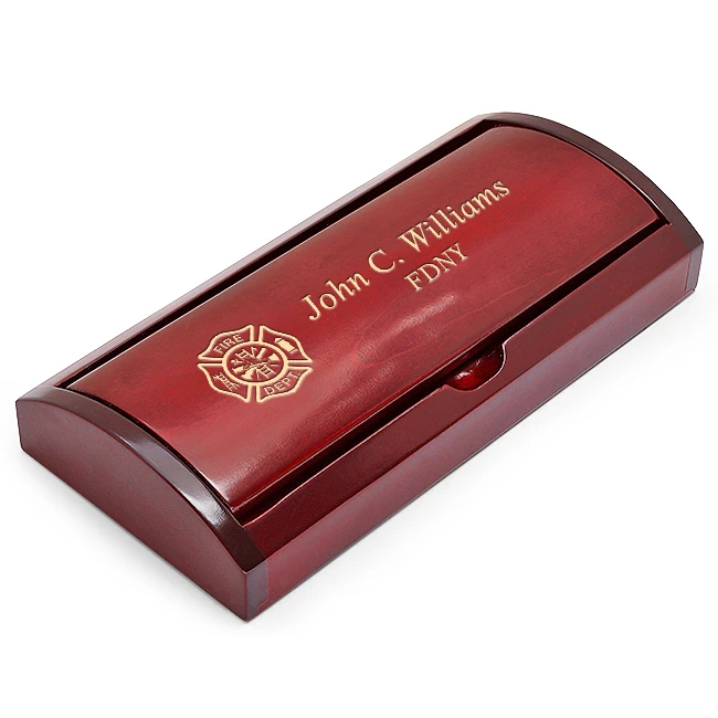 How do you say thank you to first responders like your local fire department heroes? Express your gratitude with this elegant ballpoint pen and mechanical pencil that are set in a handsome wooden case thats engraved with the Fire Department emblem. The set features black lacquer barrels with gold-tone accents and a studded cap with a pocket clip. We are happy to personalize the case with your favorite firefighters name for free with your purchase. The set comes packaged in a presentation gift box.