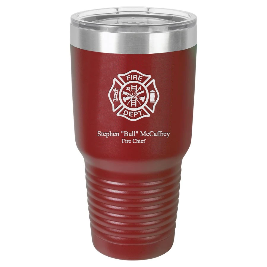 Your favorite firefighter will be ready for a full-on day with this maroon Polar Camel travel mug that holds up to 30 oz. of a favorite beverage! It has a easy-grip ringneck base that fits easily into most cup holders, and has a clear plastic lid. The mug features double-wall vacuum-insulated stainless steel construction that retains heat/cold twice as long as standard mugs. Personalization of 4 lines of text is free, and sits below a laser-engraved firefighter’s emblem. This travel mug comes packaged in a handsome gift box.