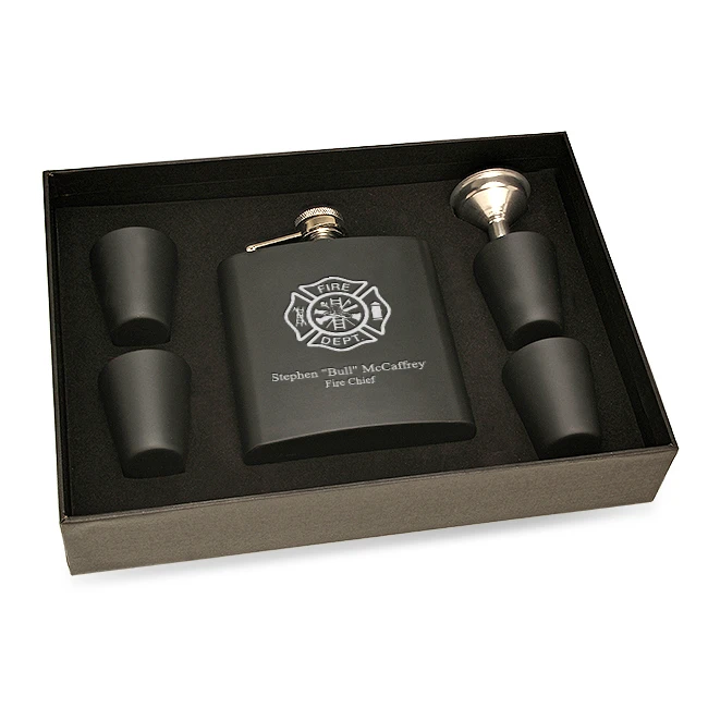 A hard-working firefighter will appreciate this gift for enjoying the off hours! Its a black stainless steel flask that holds 6 oz. of a favorite alcohol, and has a leakproof captive screw-on lid. The flask comes with a set of 4 matching shot glasses and a pouring funnel. Make your gift even more special by ordering free laser-engraving of up to 3 lines of text that will appear below the engraved firefighter’s emblem on the front. The flask set comes packaged in a handsome gift box, ready to present for any occasion.