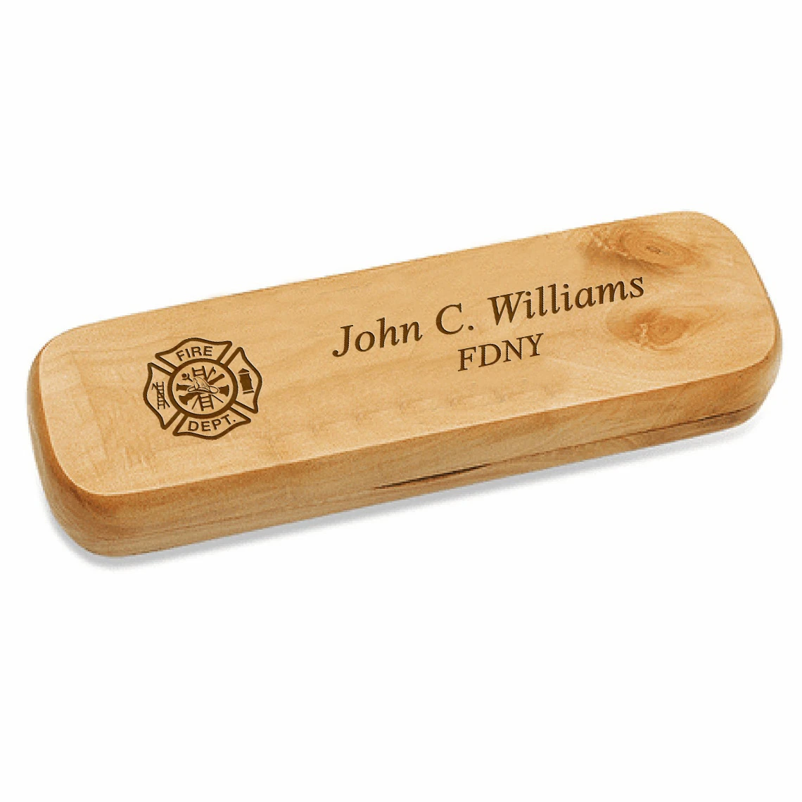 Recognize the achievement and service of a firefighter with this classic ballpoint pen set! Two maple wood ballpoint pens are accented in gold on the band and pocket clip and are set into grooves inside a matching maple case with a laser-engraved Firefighter’s Shield on the cover. The box and the pens can be personalized for free with your purchase of the set. The maple wood pen set comes packaged in a gift box, ready to present to a special firefighter.