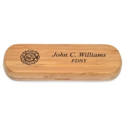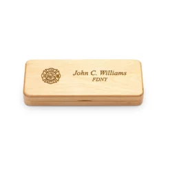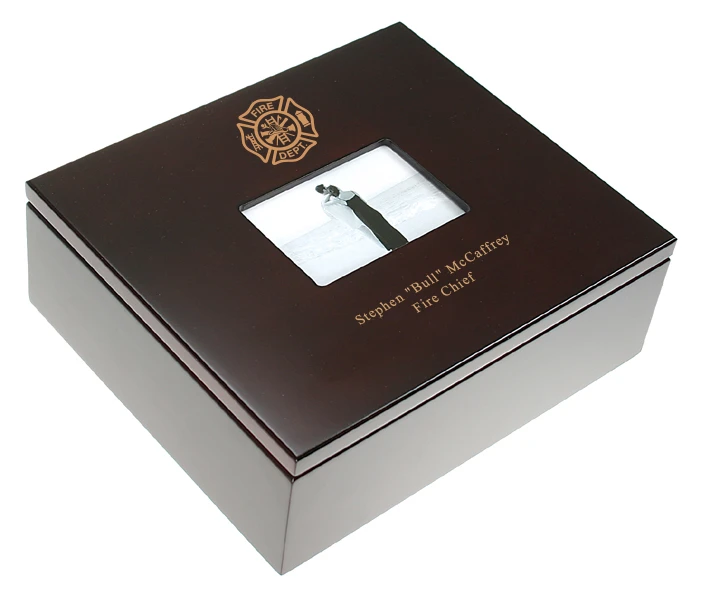 This woden keepsake box is an ideal gift for a firefighter, whether they are professional or volunteer. Made of solid wood with a dark, espresso finish, it has a photo window prominently displayed on the front lid. Above this display, the box comes with a fire department logo laser engraved prominently. Below it, you’ll add a laser engraved inscriptoin like a name and date or a short inpirational quote. Inside, the box has a velour lining and is ideal for holding photographs, small trinkets like keys or desk accessories. This firefighter theme keepsake box is a unique gift for your favorite member hero, one that will become a cherished keepsake.