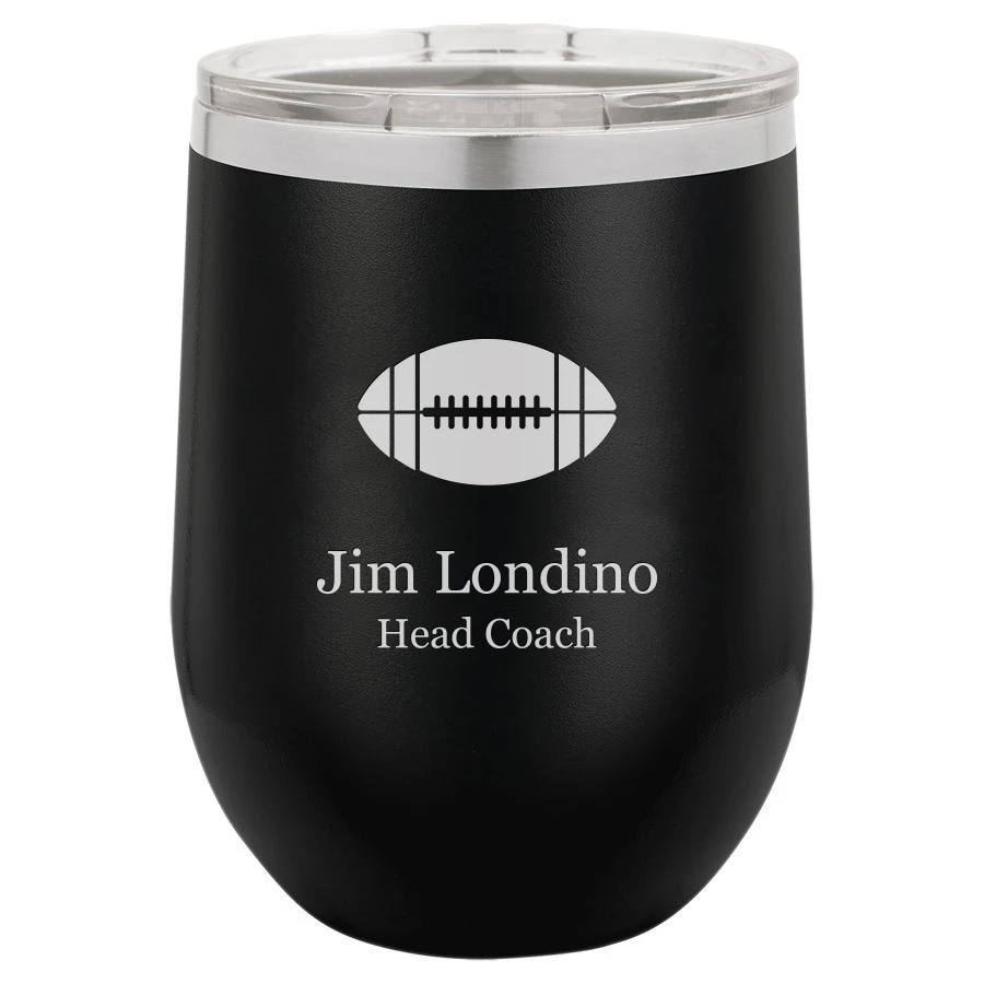 Entertain fellow football fans and corporate guests in style with this personalized black Polar Camel stemless wine glass. It’s made of double-wall vacuum-insulated stainless steel that retains that perfect chilled wine temperature twice as long as standard wine glasses. The front features a laser-engraved football emblem and, whether you purchase one for yourself or dozens for an event, personalization is free with your purchase. The wine glass comes packaged in a gift box.