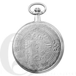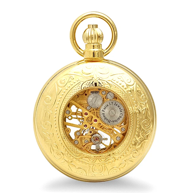 The well-dressed businessman relies on fine accessories for the finishing touches! Give him a unique pocket watch he will love wearing and displaying every day! This Charles Hubert polished gold watch and matching chain has an embossed cover design with central viewing windows that reveal the inner watch 17-jewel mechanism. Inside the cover is a white calendar dial with black Roman numerals and hands. This watch comes in a Charles Hubert gift box.