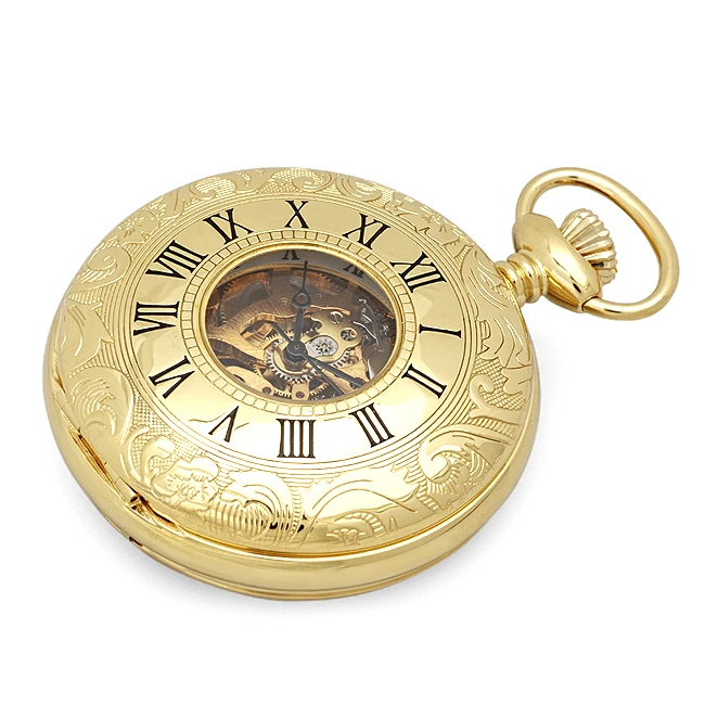 - Polished gold tone mechanical pocket watch & matching 12″ chain