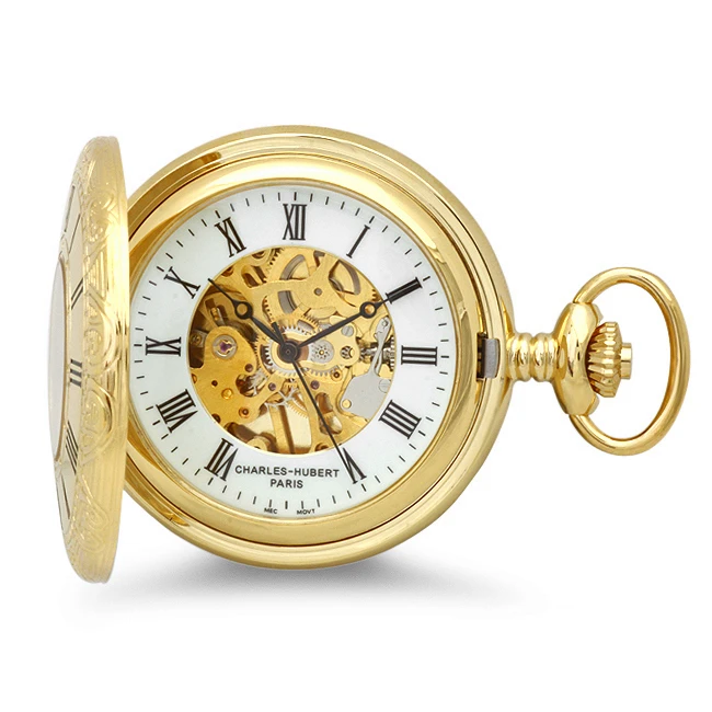 A Charles Hubert pocket watch is a gift that well-dressed men love, and adds a debonair style to their wardrobe! This polished, gold-plated watch has a clear viewing window in the embossed front cover to view the inner mechanism and hands, and is etched with black Roman numerals. Inside the cover, the watch has a white chapter ring dial, black Roman numerals and hands, and shows the 17-jewel mechanism interior. This pocket watch has a matching 12″ chain, and comes packaged in a Charles Hubert gift box.