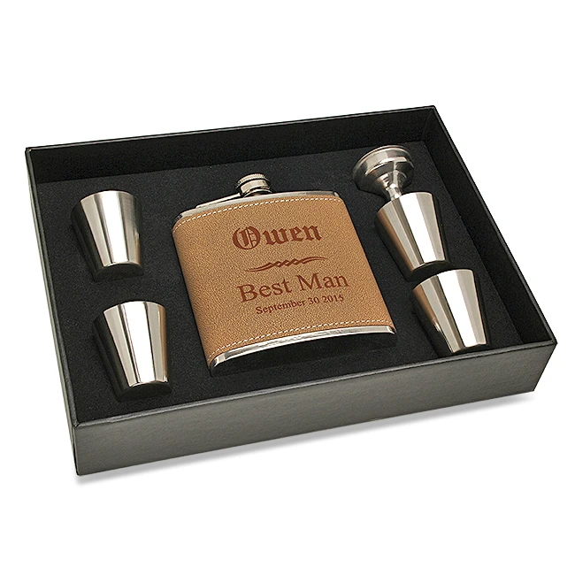 Your groomsmen will be thrilled at the rehearsal dinner when you present them with this elegant flask gift set! The flask holds 6 oz. of their favorite alcoholic beverage, fits in a pocket, and has a leakproof captive screw-on cap. The set includes 4 shot glasses and a funnel, and comes in a storage box with spaces for each piece. A faux leather exterior wrap adds a masculine touch, and can be custom engraved with his first name, wedding title, and date of wedding for free!