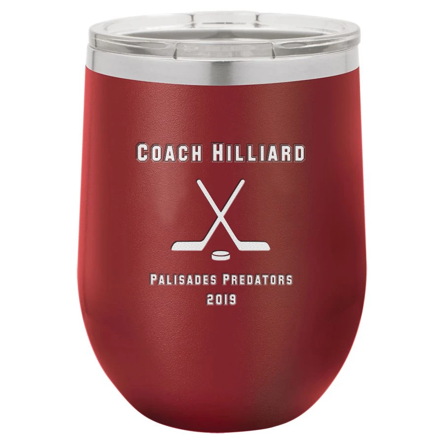 This 12 oz. maroon polar camel stemless wine glass is designed to retain the ideal temperature of wine, made with double wall vacuum insulated stainless steel, and includes a clear plastic lid that’s great for tailgate parties and events. Add free personalization of the hockey coach’s name, team name and year below the engraved hockey stick motif on the front of the glass, and your keepsake coach’s gift will be as thoughtful as it is practical! The wineglass is packaged in a gift box.