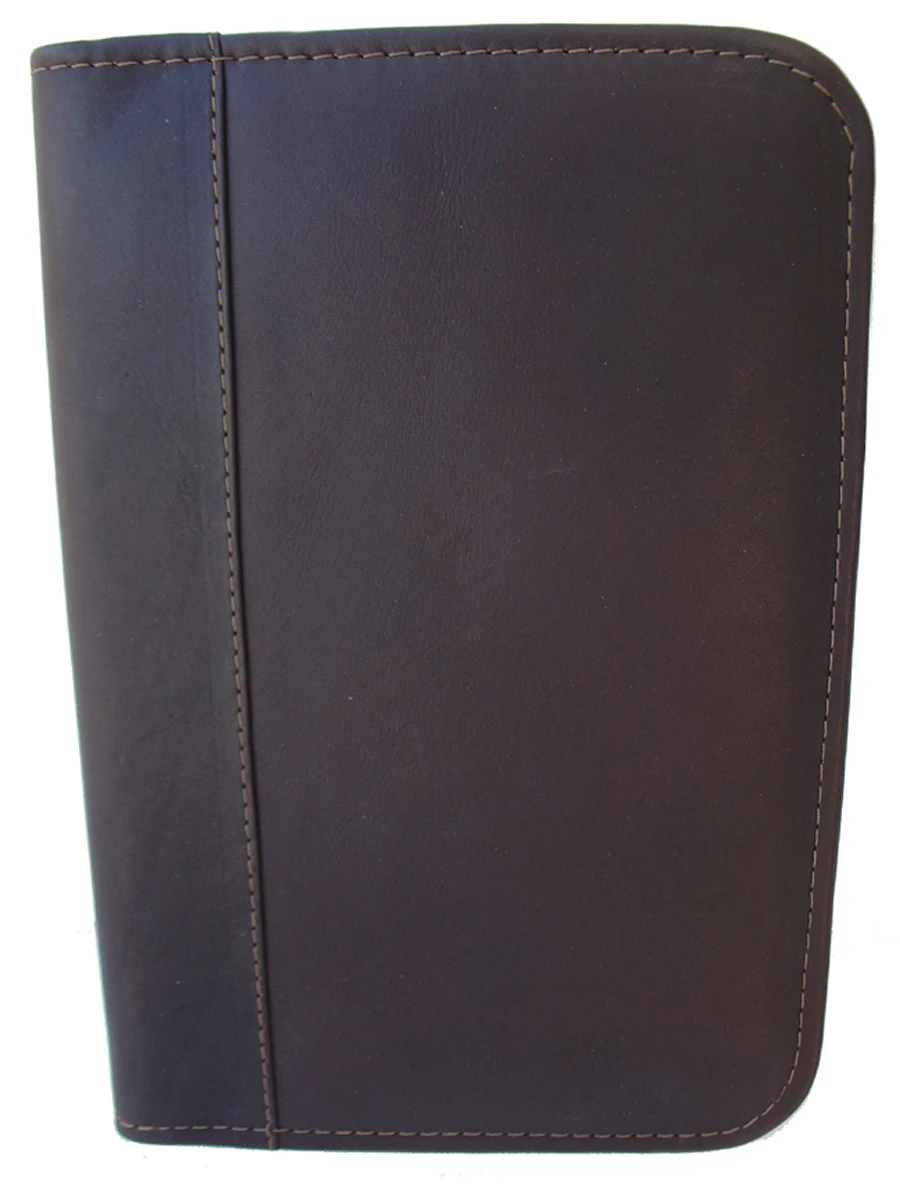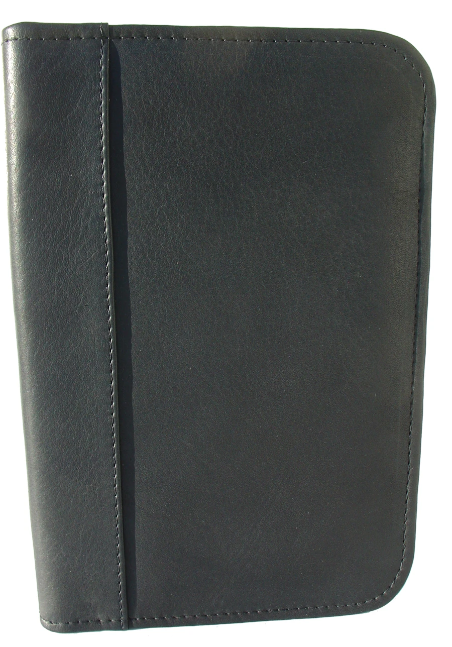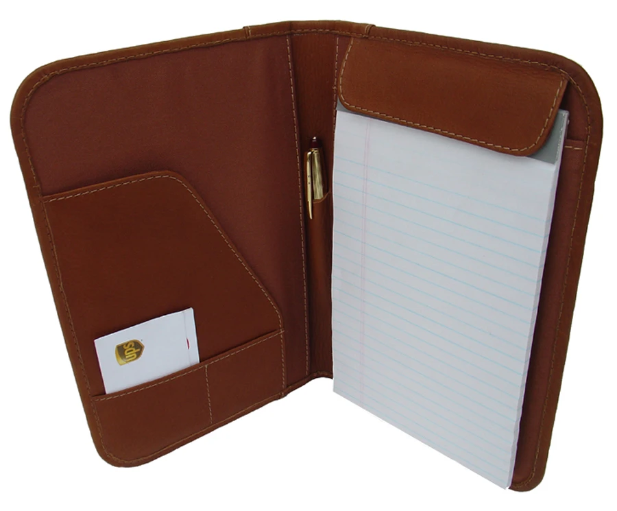 A more compact writing tool, this compact leather padfolio from the Executive Gift Shoppe fits neatly into almost any purse, briefcase, or backpack. It features two open pockets for business cards or ID cards and includes a large slot for important papers or documents. It also includes a conveniently placed center pen holder so you’ll always have a writing instrument handy. A five inch by eight inch junior-size notepad holder comes complete with the notepad. Add free personalization with the embossing, or hot stamping, of up to three initials on the bottom right hand corner of the front cover. This personalized compact portfolio is a great gift for a busy executive or someone embarking on new career.