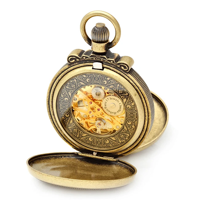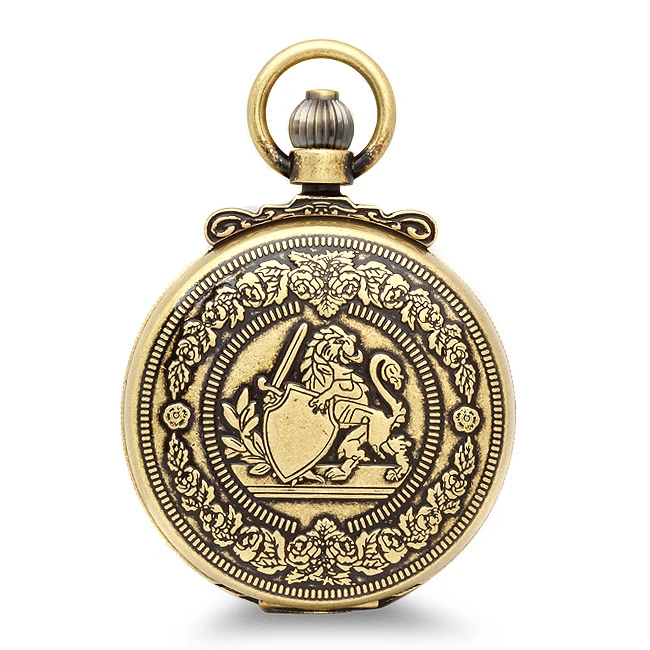 - Antique gold Lion-themed mechanical pocket watch with matching 12″ chain