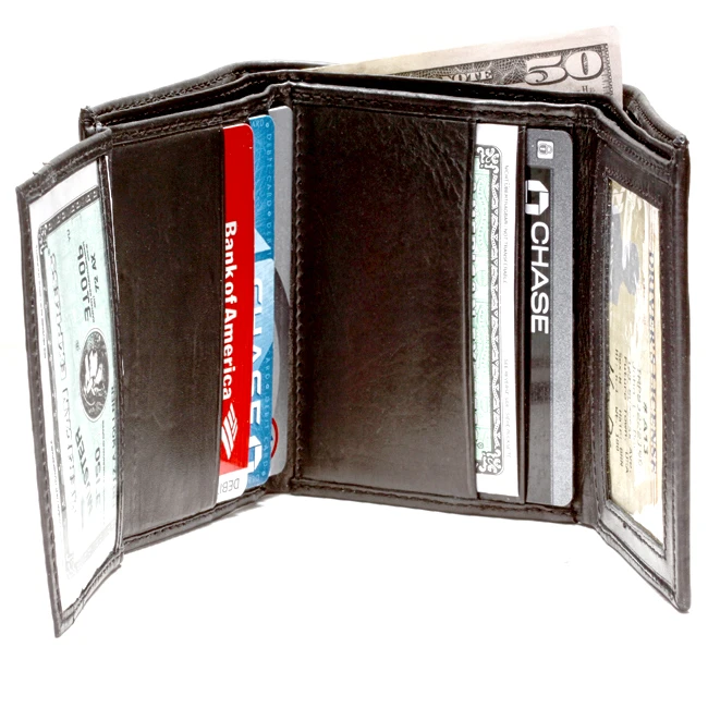 Replace that old, beaten up wallet with this personalized men’s trifold wallet. Made of genuine leather and available in black or brown, it has a ton of features: slots for up to six credit cards, two spare key pockets, two stripe-lined bill compartmen’s with a separator, and two ID windows. Add a personal touch by having it embossed with up to three initials on the bottom right hand corner of the front cover. Packaged in a gift box, this personalized trifold wallet is a fun and functional gift he’s sure to love.