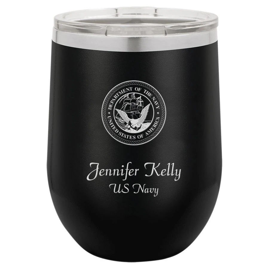 “Honor, Courage, and Commitment” are attributes that make the Navy serviceperson in your life a very special person! Show them how much you respect and value their service with this 12 oz. black stainless steel stemless wine glass gift! It has a clear plastic lid, and is made in a double wall, vacuum-insulated design that holds wine at optimal temperature twice as long as other wine glasses. The front is laser-engraved with the Navy emblem, and can be personalized for free with up to 5 lines of text. This wine glass comes packaged in a gift box.