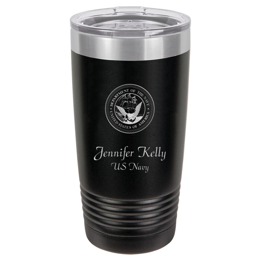 Show your respect and caring for the sailor in your family or group of friends with this 20 oz. black Polar Camel travel mug that features the US Navy insignia on the front! The mug is made of double-wall vacuum-insulated stainless steel, so it is durable and retains the inner temperature twice as long as standard mugs. It has a clear plastic lid and is designed with a narrow base that fits most cup holders. The travel mug can be personalized for free below the insignia to make your gift even more special. It comes packaged in a gift box.