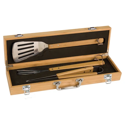 This personalized barbecue set is an ideal gift for tailgaters, backyard grillers and weekend warriors alike. The case is made of solid bamboo with a polished stainless steel handle and hardware. Inside the case, nestled in the foam lined interior are a spatula, BBQ fork and tongs. All are made of solid, environmentally friendly bamboo and stainless steel. Add customized laser engraving to the lid free of charge, making this personalized BBQ set one of a kind.