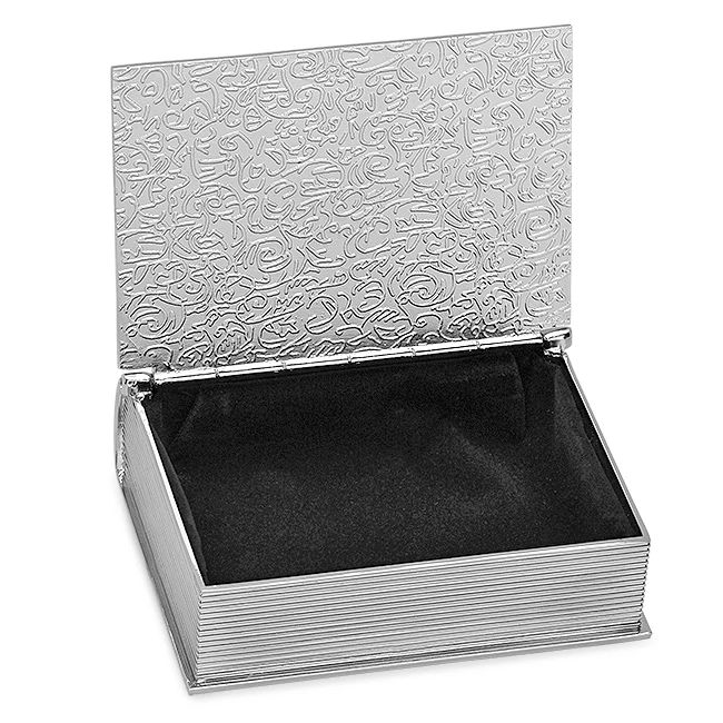 Our Bible keepsake box is the perfect gift for many occasions, like Baptism, Christening, First Holy Communion, Confirmation, or a wedding to start a new couple off on their shared memories. The outside is polished silver-tone, designed in the shape of a Bible, with an elaborately designed binding, frame edge on top and a raised Cross. Below the Cross, we will laser-engrave a name, occasion, and date for free. The book hinges open to reveal a black velour-lined interior. The Bible measures 3.5 x 2.75 inches, and can hold small treasures like a lock of hair, photos, pressed flower, or anything that has to be kept in a very special place! This Bible is sized to keep on the dresser, night stand, desk or shelf, and is a gift that so many would love to have as an expression of their Christian faith. We will package the Bible in an attractive gift box, so you will be ready to present it at your special occasion. We’ll send it right out, usually within 24 hours of receiving your order, along with our Satisfaction and Performance Guarantee!