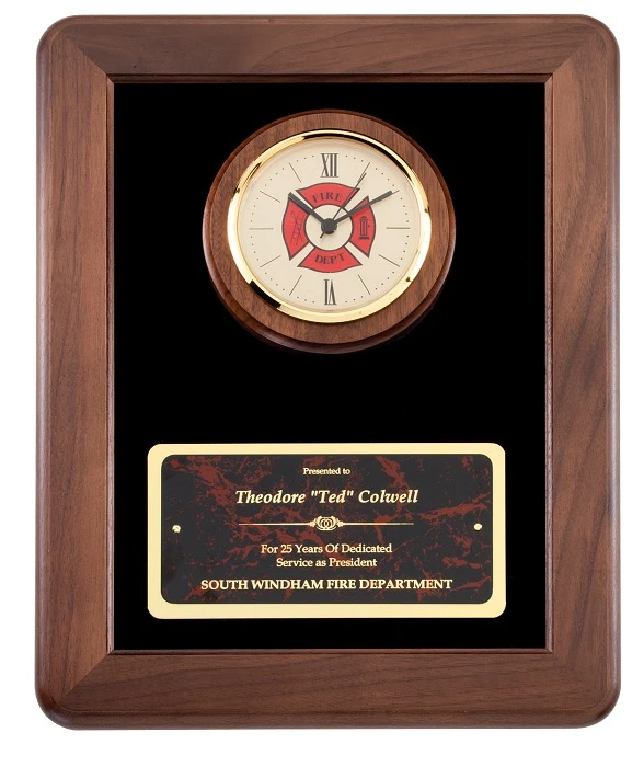 This personalized wall clock and recognition plaque is a great way to commemorate a special achievement by a firefighter. It has a picture frame walnut border that frames a velour background. A quartz clock is set in towards the top. The clock has an antique white dial with a fireman’s shield printed in the center of it in vibrant color. It includes a gold and walnut bezel around the outside. Below the clock is a red marble and brass engraving plate. Add your text to this plate, and customize it, by checking the Personalize It box above.