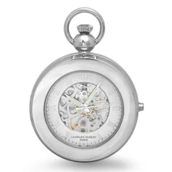 The soft gleam of gold in this Charles Hubert pocket watch adds an elegant accessory to his business and formal wardrobe. The polished gold-plated case has an engravable shield on the front that can be inscribed with his initials, and the back cover can be engraved with up to 4 lines of inscription as well. Inside, a white dial has contrasting black Roman numerals, hands, and date sub-dial. This stunning pocket watch comes with a matching 12″ chain, and is packaged in a Charles Hubert gift box.