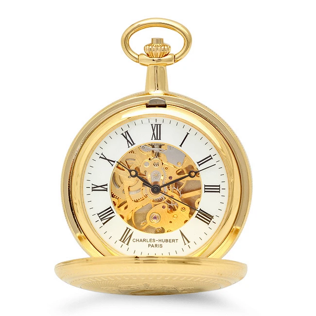 Give him a unique personalized gift he will be proud to wear, with this Charles Hubert gold-plated pocket watch and matching 12′ chain. This watch is designed with dual-opening covers that create a stand for desk or night table, and the front can be engraved with up to 3 intials on the smooth shield. Inside the watch is a clear skeleton dial with white chapter ring, black Roman numerals and hands, and a view to the watch’s inner 17-jewel mechanism. This pocket watch comes packaged in a Charles Hubert gift box.