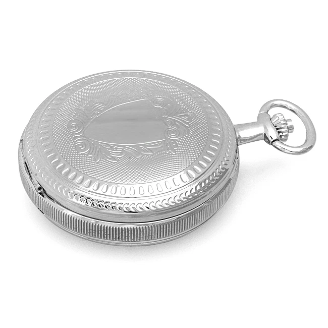 This Charles Hubert pocket watch is designed with classic silver-plated, etched finish, with a shield pattern on the front for engraving up to 3 initials at no extra charge! The front and back covers open to reveal a skeletal dial that reveals the watch’s inner mechanism. The white chapter ring and contrasting black Roman numerals and hands are striking and easy to read. This watch comes with a matching 12″ chain, and is packaged in a Charles Hubert gift box.