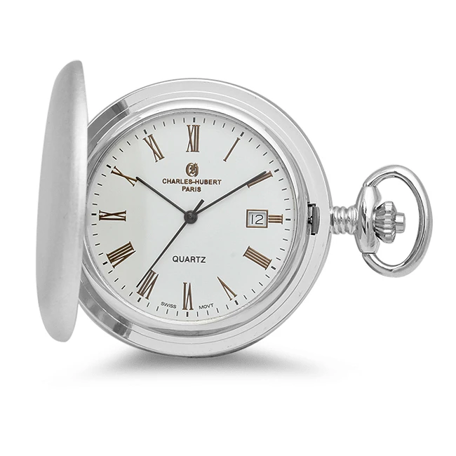 This brushed satin-finish Charles Hubert pocket watch is the perfect choice for giving for any special occasion! The watch exterior is made of stainless steel with rhodium-plating, and has a matching 12″ chain. Inside, the white dial has silver Roman numerals and black hands, a scratch-resistant lens, and a battery-operated quartz movement. Add free custom personalization to add an inscription to an heirloom gift that will be treasured for years.