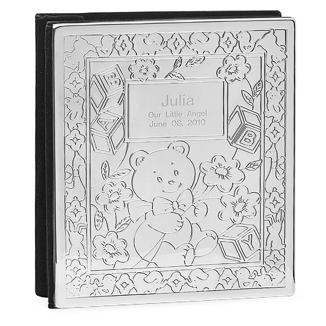 Are you looking for a gift for a baby shower or newborn gift? Do you like to give something that can be a keepsake for Baby to have for a lifetime? Our baby photo album may be just what you have in mind! The polished silvertone cover is engraved with a baby-themed design of a teddy bear with blocks and flowers in the center, framed by baby animals around the edge. We will laser-engrave Babys name, birth date, and another line of text in a framed box above the teddy bear and the engraving is free! Inside the album is a black, velour-lined interior, with 50 pages to hold 100 4x6 photos. The album measures 5.75 x 6.5 x 2 inches, perfectly sized to display on a desk, side table, or bookshelf when you want to show off every cute expression and all of Babys firsts! We will package the album in an attractive gift box, and well send it right out, usually within 24 hours of receiving your order, along with our Satisfaction and Performance Guarantee!