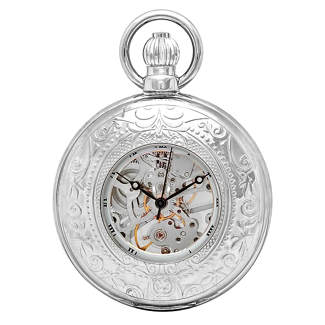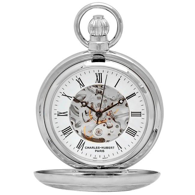 The intricately-etched design on the front and back covers of this Charles Hubert pocket watch creates the perfect frame for the white calendar dial that reveals the watch’s inner precision 17-jewel mechanism, as well as contrasting black Roman numerals and black hands. This pocket watch comes with a matching 12″ chain to attach to clothing, and is packaged in a signature Charles Hubert gift box. It’s a wonderful choice to give the man who loves classic accessories!