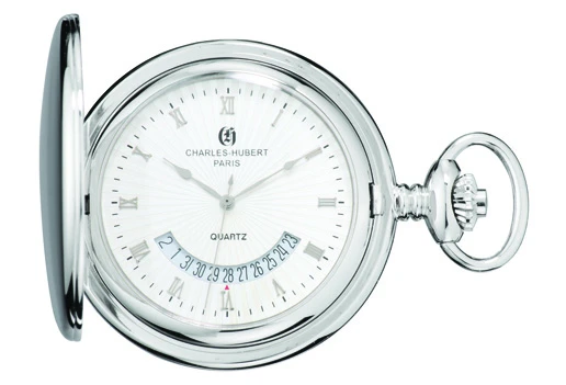 This elegant quartz pocket watch by Charles Hubert adds a sophisticated touch to his professional look! The exterior casing is polished silver-plated steel, and can be engraved for free, with up to 4 lines of inscription on each cover to add a unique, meaningful touch to your gift. Inside, the watch features a white dial with arched date sub-dial, silver hands, and silver Roman numerals. This pocket watch has a matching 12″ chain, and comes packaged in a signature Charles Hubert gift box.
