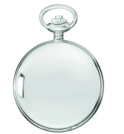 - Polished silver-plated pocket watch with 12″ chain