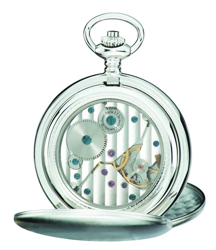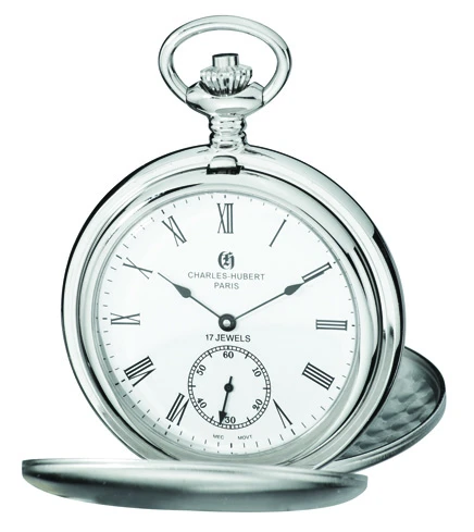 A wind-up precision 17-jewel mechanical movement, combined with a polished silver-plated exterior, create a timepiece that is the perfect gift for any special occasion! This pocket watch comes with a matching 12″ chain, with a viewing window in the back to see the inner mechanism. The covers can be engraved for free, with up to 4 lines of inscription on each. This watch is packaged in a signature Charles Hubert gift box, ready to surprise the man who has everything!
