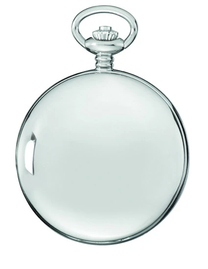 - Polished silver-plated steel pocket watch with 12″ chain