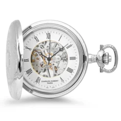 Beautifully etched with a floral design on front and back, this Charles Hubert polished stainless steel pocket watch is a wonderful choice for the man who likes to dress for success! The interior features a skeleton dial with white chapter ring and black numerals and hands, and reveals the 17-jewel mechanism movement, behind a scratch-resistant lens. The pocket watch comes with a matching 12″ chain, and is packaged in a signature Charles Hubert gift box.