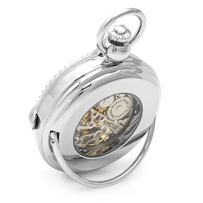 This unique Charles Hubert pocket watch is designed in elegant polished silver, with viewing windows on front and back to see the inner 17-jewel mechanism, numerals and hands. The interior has a white dial with silver Roman numerals and luminescent hands, The pocket watch comes with a 12″ matching chain, and has an attached desk stand to display on a desk or bedside table.This artistically-crafted pocket watch comes in a signature Charles Hubert gift box.