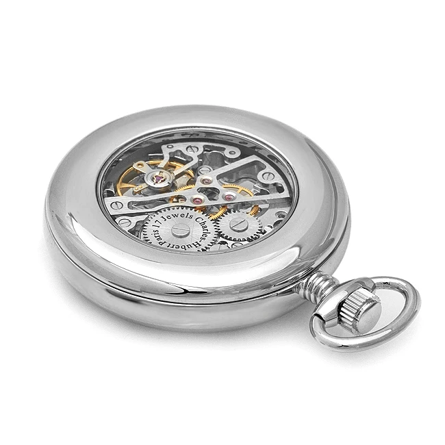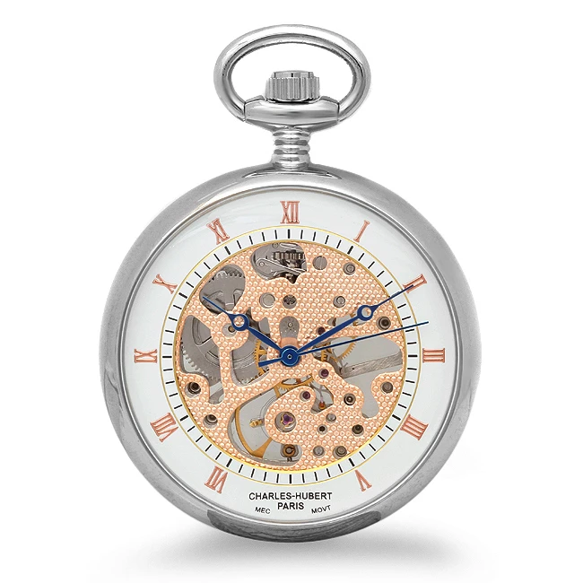 This striking men’s pocket watch, by Charles Hubert, has distinctive coloring that sets it apart from the rest…a perfect gift for the man of distinction in your life! The open face features a white chapter ring, with rose gold Roman numerals, and bright blue hands, with an open center that reveals the watch’s inner 17-jewel mechanism. A clear port window in back offers the same mechanical view. This watch comes with a matching 12″ chain, and is packaged in a Charles Hubert gift box.