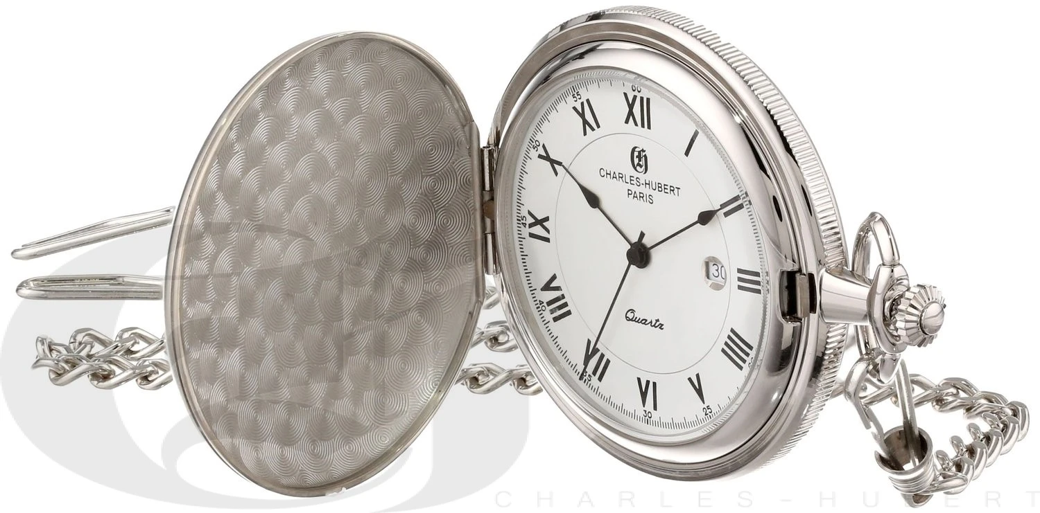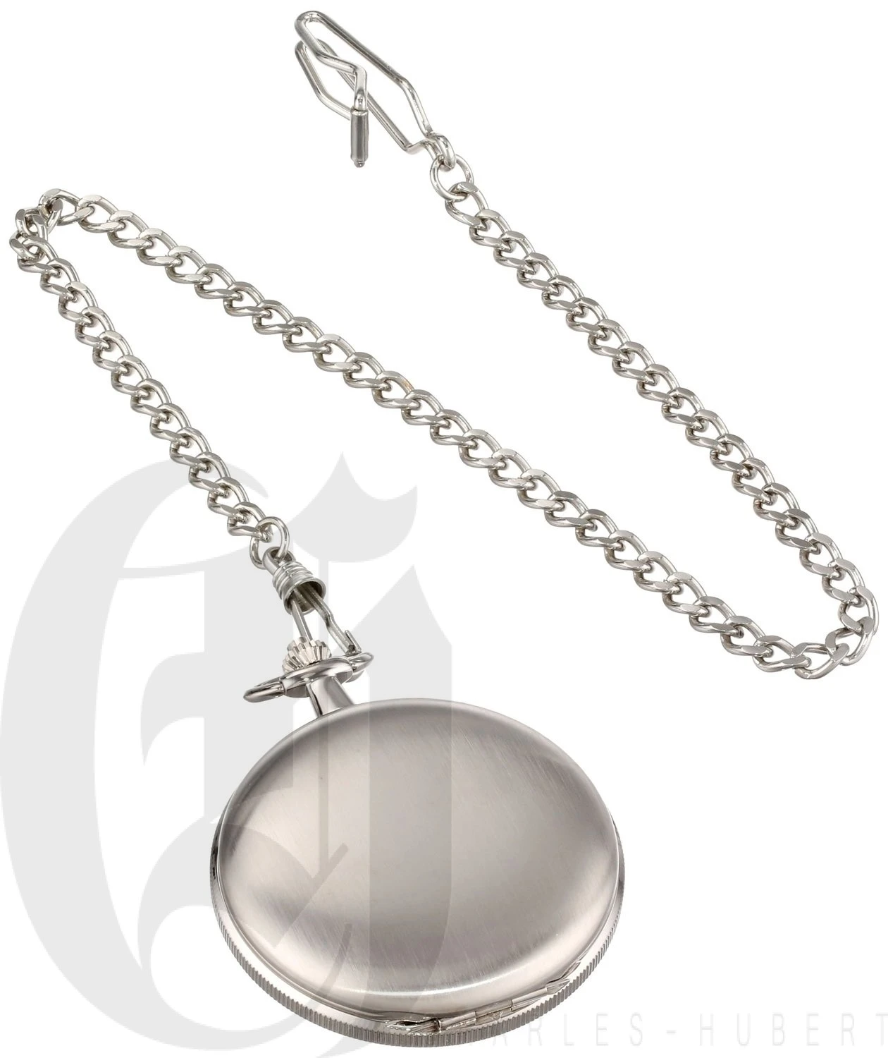 Modern precision quartz movement and old time classic charm combine in this Charles Hubert silver tone pocket watch. The smooth front and back covers are the perfect place for free custom engraving with up to four lines of keepsake inscription on each cover. The watch inside features a white dial with black Roman numerals and hands, and the watch is attached to a matching 12″ chain. Your thoughtful gift comes packaged in a Charles Hubert gift box.