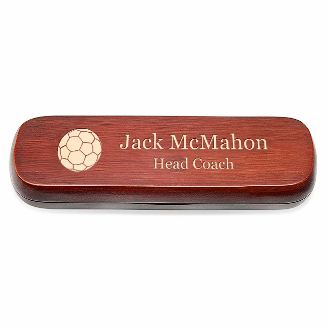 At the end of the season, win or lose, there are some people who deserve recognition for their hard work and dedication to the team. Let them know how much you appreciate their efforts with this genuine cherry wood pen set. Two ballpoint pens with cherry wood barrels and gold accents are held inside a matching case that is laser-engraved with a soccer ball emblem. The case, pens, or both can be personalized with your text for free with your purchase. This set comes packaged in a gift box.