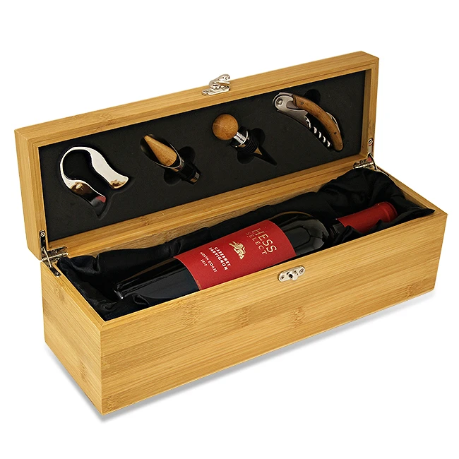 A elegant way to present a wine gift, this bamboo wine box will be displayed long after the wine is gone! The case hinges open and has a silver ornate clasp. It is lined in elegant black velour, and includes a foam insert inside the lid securing a corkscrew, bottle topper, cutter and pourer. Personalize your gift for free with a large monogram initial split with a full last name in a central cutout. All you have to do is pick out the perfect wine, and you will present a gift they will never forget! The wine box comes packaged in a gift box.