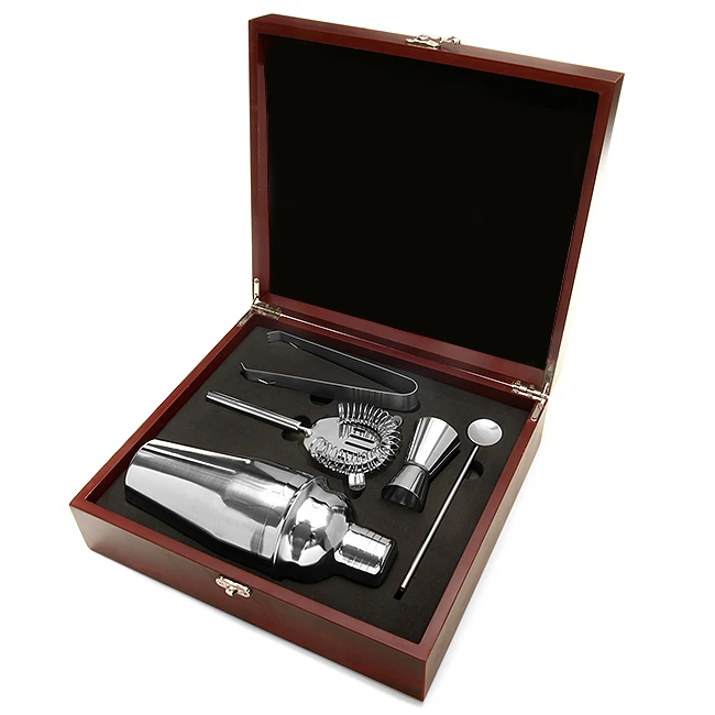- Includes shaker, jigger, strainer, stirrer & tongs