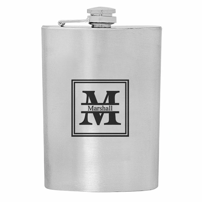 Take this stainless steel flask along on weekender trips, business travel, and BYOB cocktail parties! It has a captive screw-on lid and holds 8 oz. of a favorite liquor. The center front features your choice of large last name initial, intersecting with full last name engraving, available at no extra charge. This is an ideal gift idea for corporate gifts, birthdays, anniversary, promotion or groomsmen, and comes packaged in a handsome gift box.